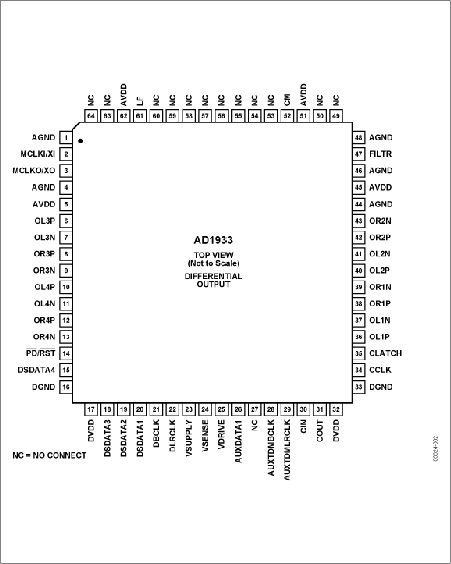 AD1933是一款高性能、单芯片编解码器,内置8个数模转换器(DAC),提供差分输出,采用ADI的多位Σ-Δ专利架构。它具有一个SPI端口,微控制器利用该端口可以调整音量和许多其它参数。该器件采用3.3 V数字电源和模拟电源供电,并提供64引脚(差分输出)LQFP封装。该系列还包括单端DAC输出和I2C® 控制端口产品。AD1933设计用于低电磁辐射(EMI)环境,系统架构和电路设计架构均明显体现了这一点。它利用片上PLL从LR时钟或外部晶振获得主时钟,因而无需独立的高频主时钟,并且也可以结合抑制位时钟使用。DAC设计采用ADI公司最新的连续时间架构,使电磁辐射进一步降低。通过使用3.3 V电源,功耗达到最小,辐射也进一步降低。