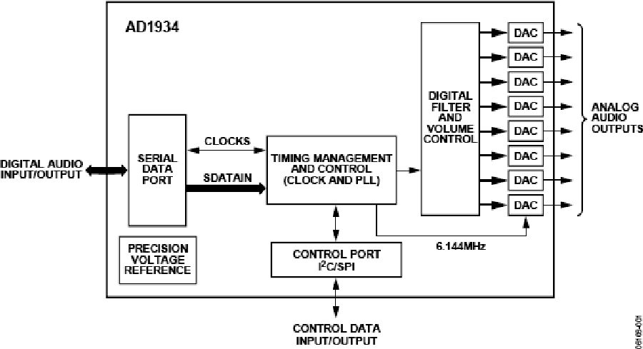 AD1934是一款高性能的单芯片编解码器,采用ADI公司专利的多比特Σ-Δ架构,可提供8个带单端输出的数模转换器(DAC)。内置的SPI 端口使微控制器可以调整音量和许多其它参数。AD1934 采用3.3 V数字与模拟电源供电,48引脚(单端输出)LQFP封装。这个产品系列的其它成员包括差分DAC输出以及I2C®控制端口版本。AD1934在系统和电路架构上都针对低电磁干扰(EMI)而设计。AD1934利用内置PLL驱动LR时钟或外部晶振的主时钟,从而无需单独的高频主时钟,而且可与抑制位时钟配合使用。这款数模转换器采用ADI公司最新的连续时间架构进行设计,进一步减小了电磁干扰。AD1934采用3.3 V电源供电,实现了最低功耗,进一步降低了电磁辐射。