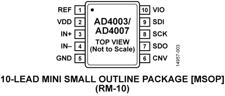 AD4003采用10引脚MSOP或10引脚LFCSP封装,工作温度范围为−40°C至+125°C。该器件与16位、2 MSPS AD4000引脚兼容。