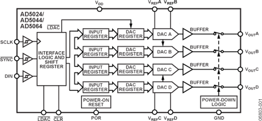 AD5024/AD5044/AD5064是低功耗、四通道12/14/16位缓冲电压输出nanoDAC® DAC,相对精度特性为1 LSB INL(积分非线性)、1 LSB DNL(微分非线性),具有独立的基准电压引脚,可以采用4.5 V至5.5 V单电源供电。此外还提供±1 LSB的微分精度特性。这些器件采用多功能三线式、低功耗、施密特触发器串行接口,能够以最高50 MHz的时钟速率工作,并与标准SPI、QSPI™、MICROWIRE™和DSP接口标准兼容。片内提供集成基准电压缓冲器和输出放大器。AD5024/AD5044/AD5064/AD5064-1内置一个上电复位电路,确保DAC输出上电至零电平或中量程,并保持该电平,直到对该器件执行一次有效的写操作为止。AD5024/AD5044/AD5064/AD5064-1具有关断特性,在关断模式下,器件在5 V时的功耗降至400 nA,并提供软件可选的输出负载。器件的总非调整误差小于2 mV。