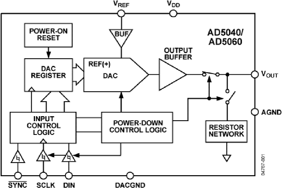 AD5040在SOT-23封装中集成了14位DAC及高性能输出缓冲器,最大积分非线性误差(INL)为1 LSB,因而是开环控制或精密增益与失调等高性能应用的理想之选。该器件采用多功能三线式串行接口,能够以最高30 MHz的时钟速率工作,并与标准SPI™、QSPI™、MICROWIRE™、DSP接口标准兼容。AD5040的基准电压通过一个外部REF引脚获得,芯片上提供基准电压缓冲,可简化该器件应用。该器件内置一个上电复位电路,确保DAC输出上电至0 V并保持该电平,直到对该器件执行一次有效的写操作为止。此外还具有省电特性,在省电模式下,器件在5 V时的功耗降至1 µA,并提供软件可选输出负载。省电模式通过串行接口启动,上电时突波非常低。