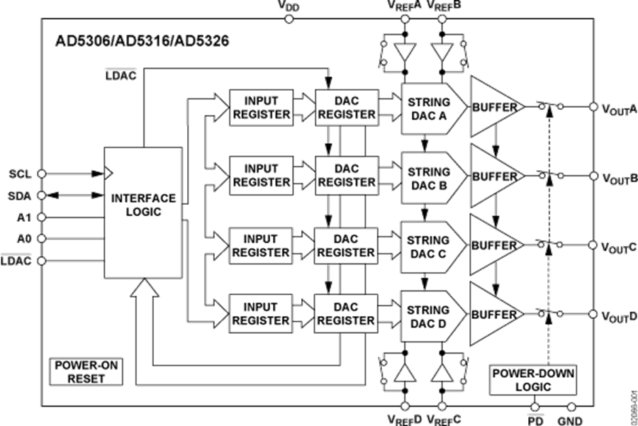 AD5306/AD5316/AD5326分别是四通道8/10/12位、缓冲电压输出DAC,提供16引脚TSSOP封装,采用2.5 V至5.5 V单电源供电,3 V时功耗为500 µA。这些器件内置片内输出放大器,能够提供轨到轨输出摆幅,压摆率为0.7 V/μs。所用的双线式串行接口能够以最高400 kHz时钟速率工作。当VDD <3.6 V时,此接口为SMBus兼容。多个器件可以共用同一总线。