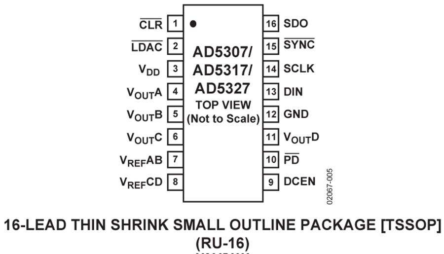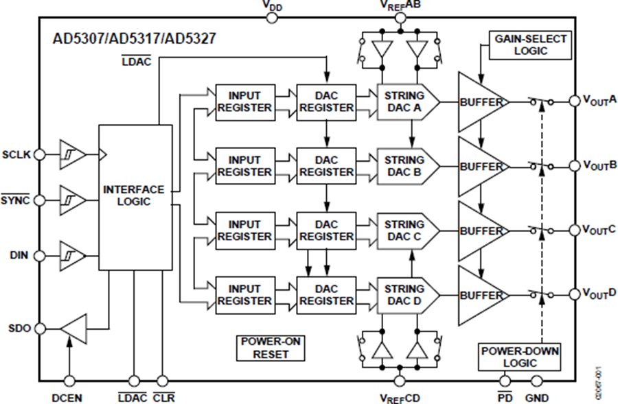 AD5307/AD5317/AD5327分别是四通道8/10/12位、缓冲电压输出DAC,提供16引脚TSSOP封装,采用2.5 V至5.5 V单电源供电,3 V时功耗为400 µA。这些器件内置片内输出放大器,能够提供轨到轨输出摆幅,压摆率为0.7 V/µs。AD5307/AD5317/AD5327采用多功能三线式串行接口,能够以最高30 MHz的时钟速率工作,并与标准SPI、QSPI、MICROWIRE、DSP接口标准兼容。