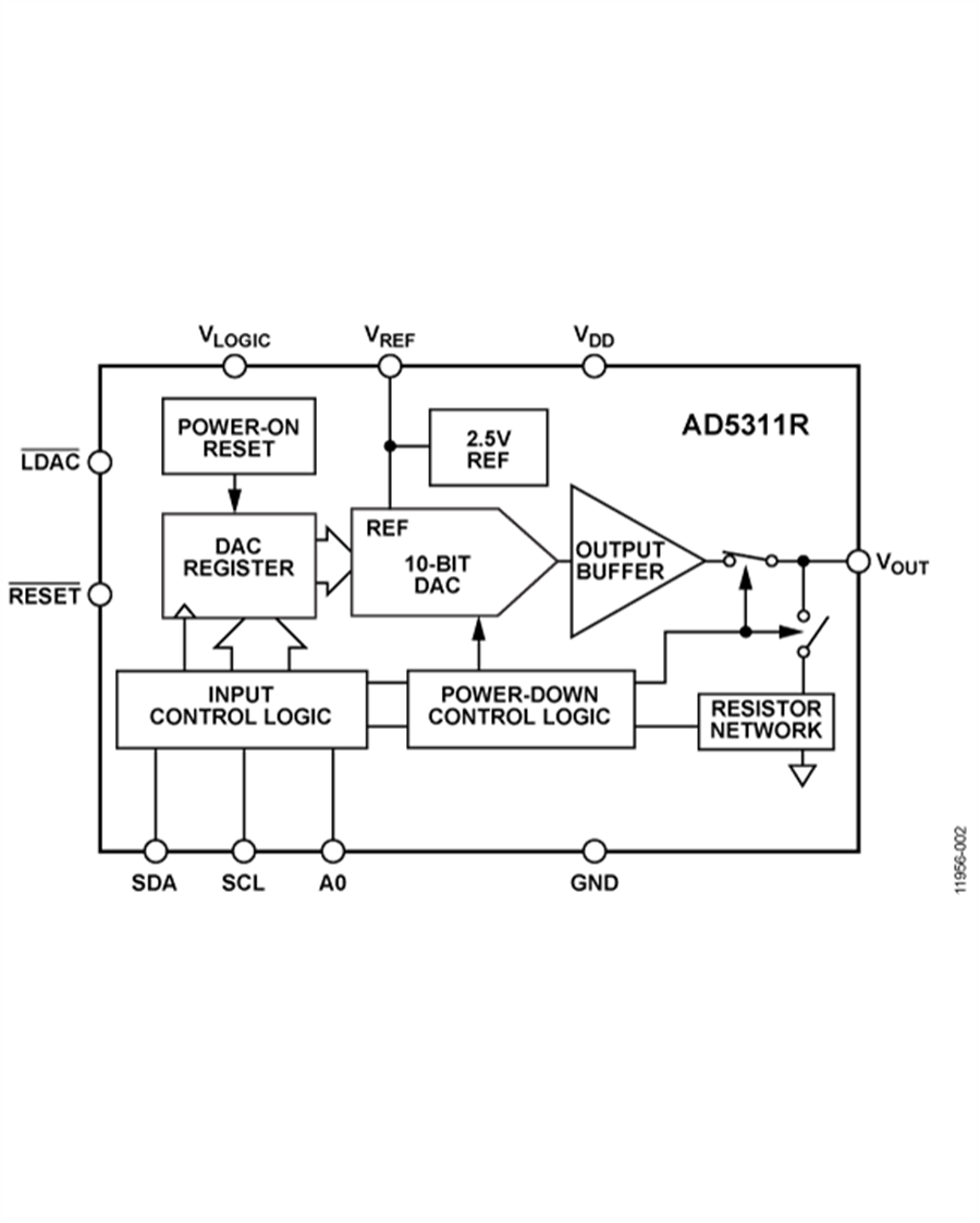 AD5310R/AD5311R采用多功能SPI或I2C 接口,包含一个异步复位引脚和一个 VLOGIC 引脚,可兼容1.8 V。