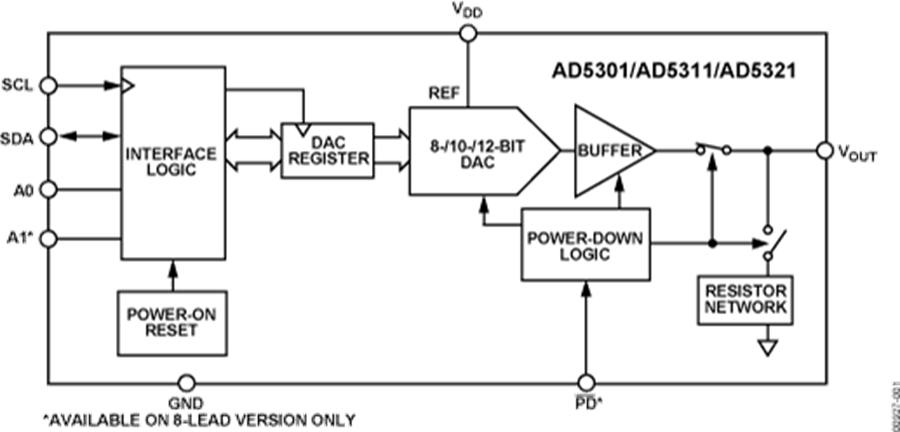 AD5301/AD5311/AD5321分别是单通道8/10/12位、缓冲电压输出DAC,采用2.5V至5.5V单电源供电,3V时功耗为120μA。这些器件内置片内输出放大器,能够提供轨到轨输出摆幅,压摆率为0.7 V/μs。所用的双线式(I2C兼容)串行接口能够以最高400 kHz的时钟速率工作。多个器件可以共用同一总线。