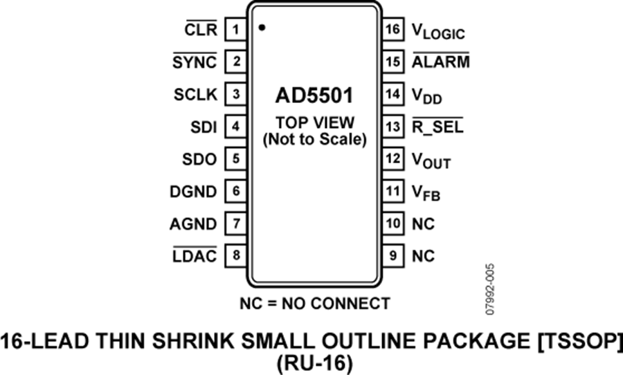 AD5501采用小型16引脚TSSOP封装。AD5501工作于扩展的温度范围−40°C至+105°C。