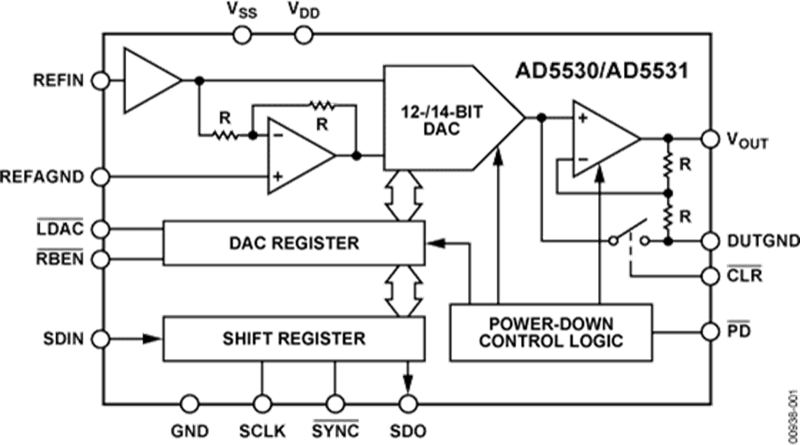 DAC输出通过一个增益为2的放大器缓冲,并以DUTGND引脚上的电位为基准。可通过LDAC引脚实现DAC输出的异步更新。利用省电引脚(PD)可以将DAC置于低功耗状态,利用/CLR引脚则可以将输出清零至用户定义的电压,即DUTGND上的电位。