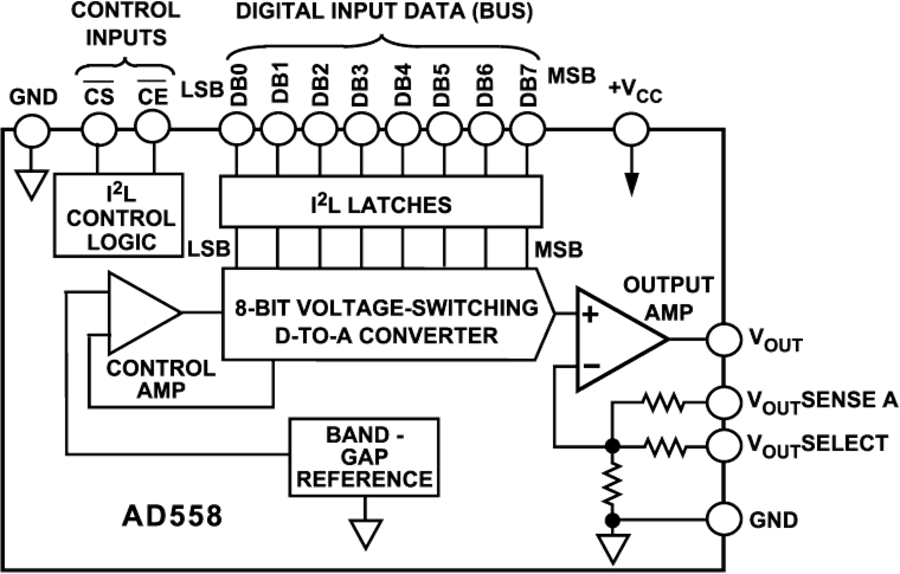 AD558 DACPORT®是一款完整的电压输出8位数模转换器,它将输出放大器、完全微处理器接口以及精密基准电压源集成在单芯片上。无需外部元件或调整,就能以全精度将8位数据总线与模拟系统进行接口。