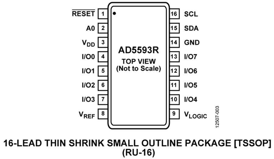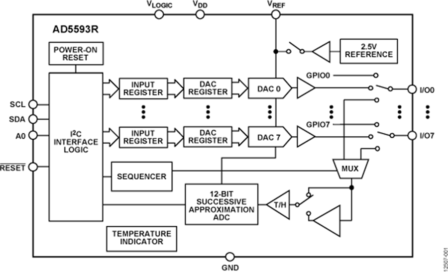 AD5593R集成8个可单独配置为DAC输出、ADC输入、数字输出或数字输入的I/O引脚。 I/O引脚配置为模拟输出时,由12位DAC驱动。 DAC输出范围为0 V至VREF,或0 V至2 x VREF。 I/O引脚配置为模拟输入时,通过模拟多路复用器连接至12位ADC。 ADC输入范围为0 V至VREF,或0 V至2 × VREF。 I/O引脚还可配置为通用数字输入或输出(GPIO)引脚。 通过I2C写/读操作访问GPIO寄存器,可置位或回读GPIO引脚状态。