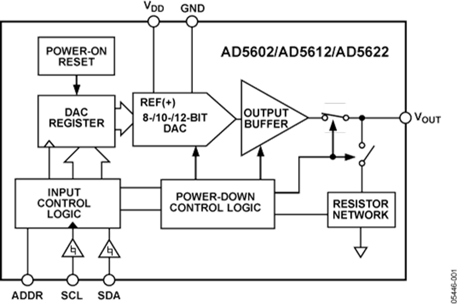 AD5602/AD5612/AD5622采用双线式I2C兼容型串行接口,能够以标准(100 KHz)、快速(400 KHz)及高速(3.4 MHz)三种模式工作。