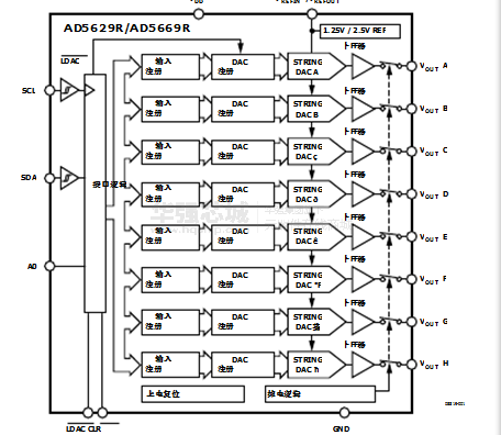 该AD5629R / AD5669R器件是低功耗,八通道,12 / 16位,缓冲电压输出DAC