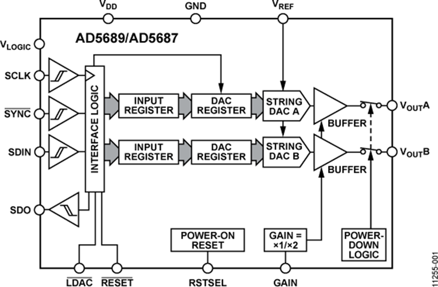 AD5687采用多功能SPI接口,时钟速率最高达50 MHz,并均包含一个为1.8 V/3 V/5 V逻辑电平准备的VLOGIC引脚。