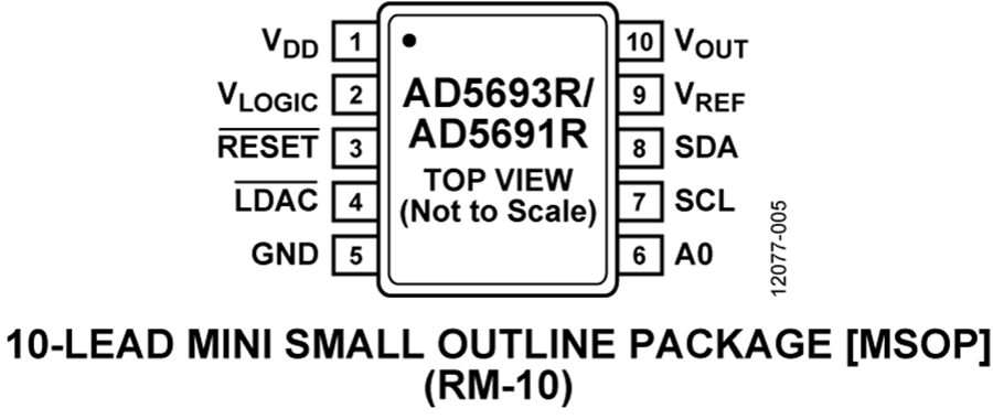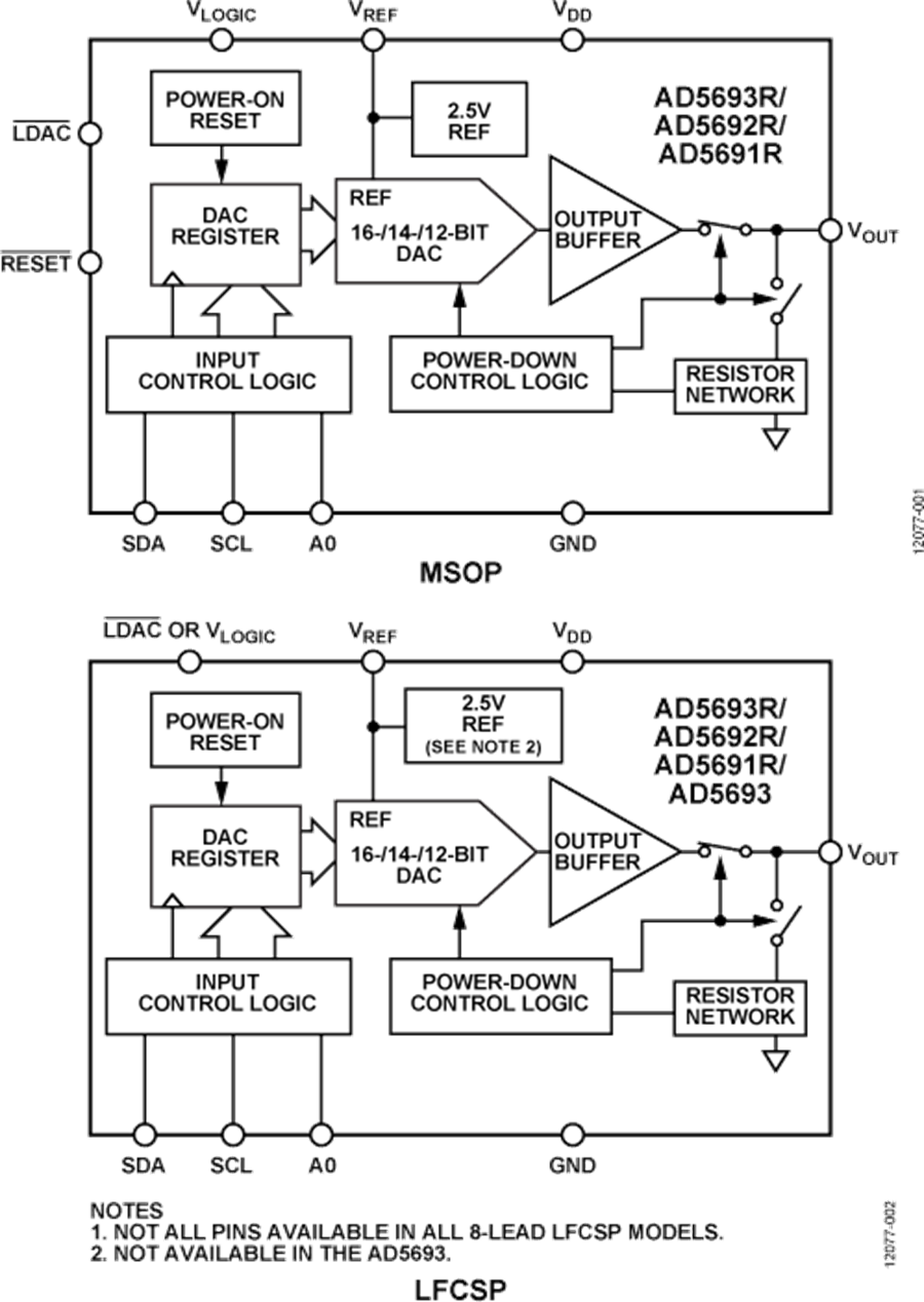 AD5693R/AD5692R/AD5691R采用 I2C接口。 某些器件选项还提供异步 RESET 引脚和 VLOGIC引脚,可兼容1.8 V。