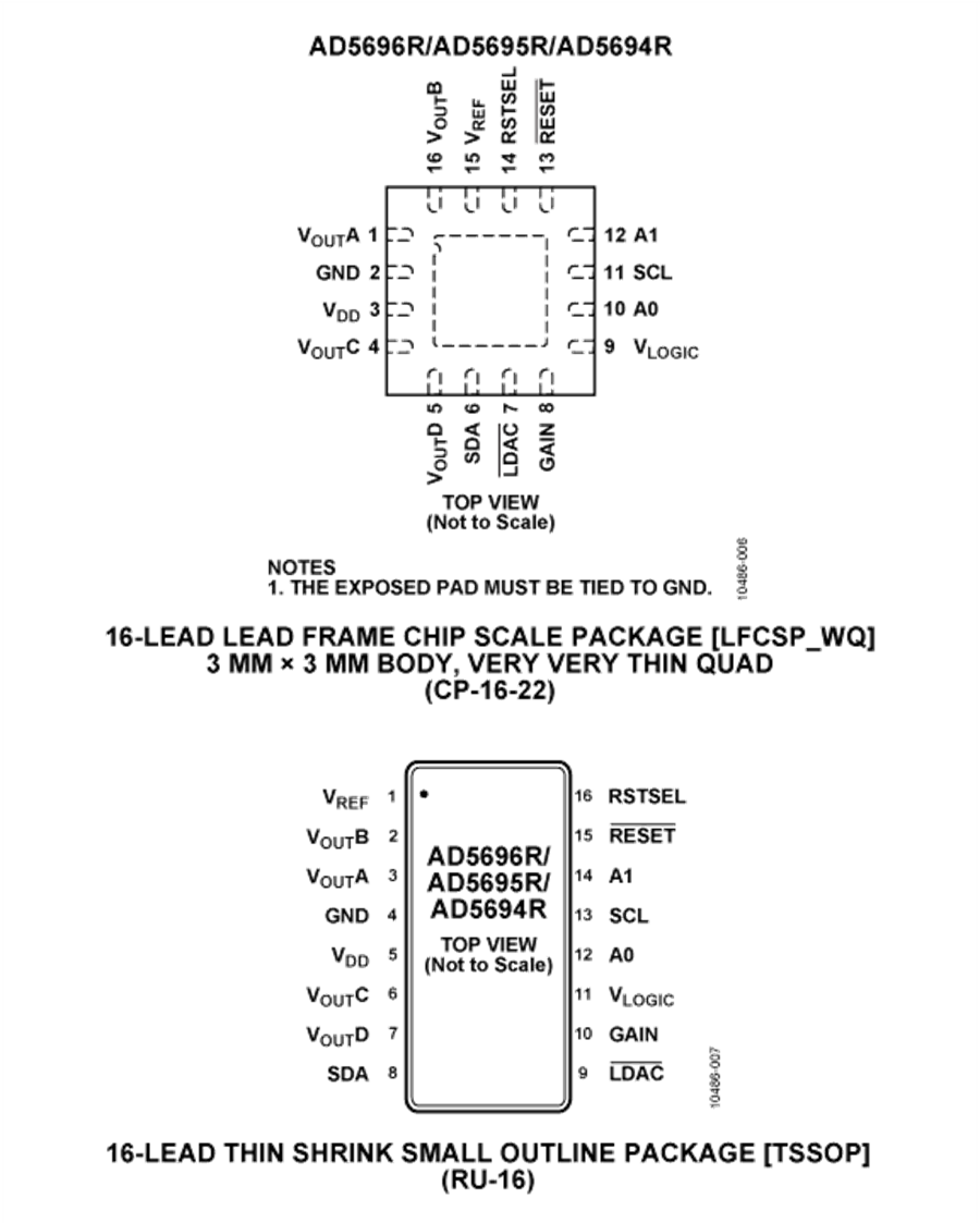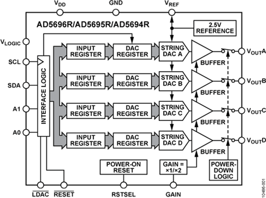 AD5694R采用I2C接口,时钟速率最高达400 kHz,包含一个为1.8V/3V/5V逻辑电平准备的VLOGIC引脚。