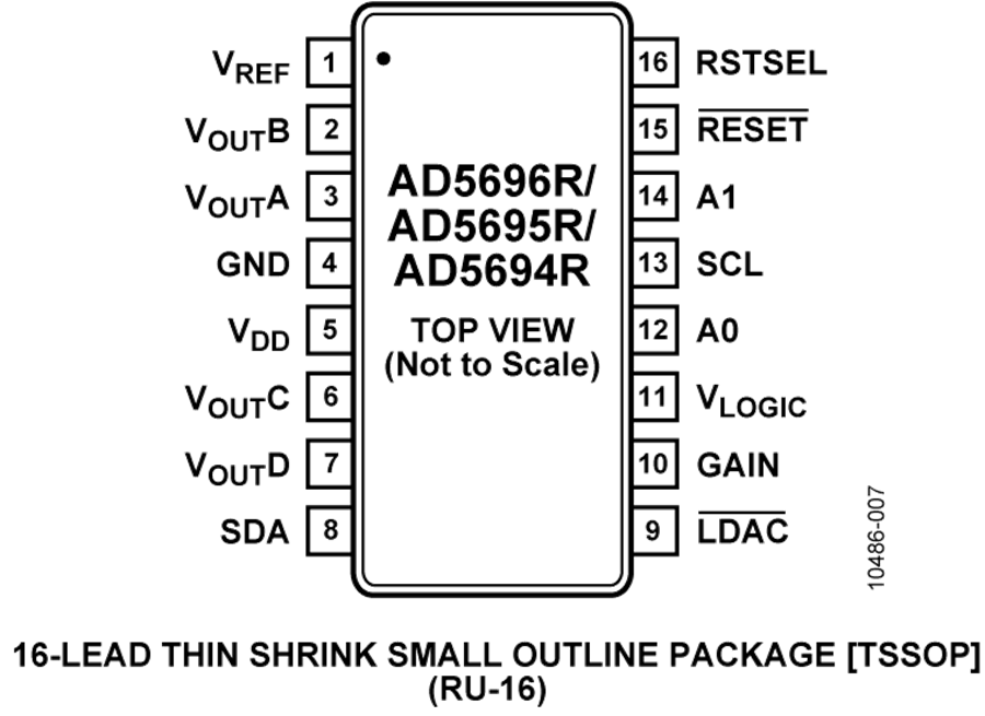 AD5695R采用I2C接口,工作时钟速率最高达400 kHz,并内置适用于1.8 V/3 V/5 V逻辑的VLOGIC引脚。