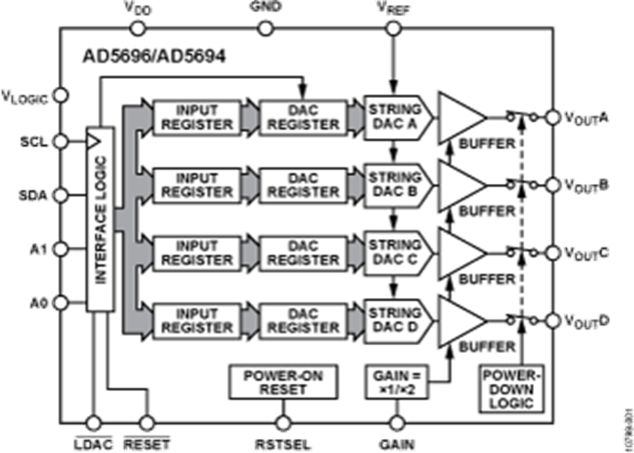 AD5696采用多功能双线式串行接口,时钟速率最高达400 kHz,包含一个为1.8 V/3 V/5 V逻辑电平准备的VLOGIC 引脚。