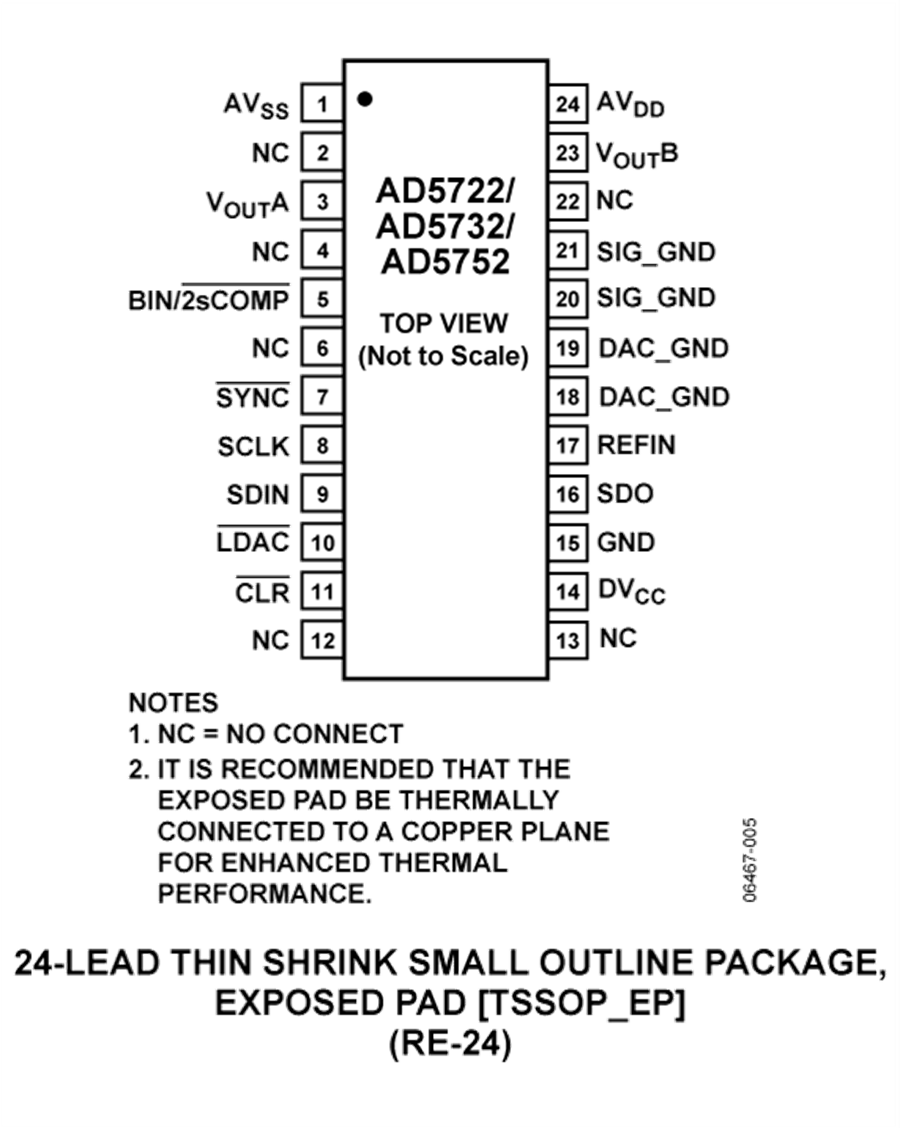 AD5722/AD5732/AD5752与AD5724/AD5734/AD5754引脚兼容,后者是完整的四通道、12/14/16位、串行输入、单极性/双极性电压输出DAC。