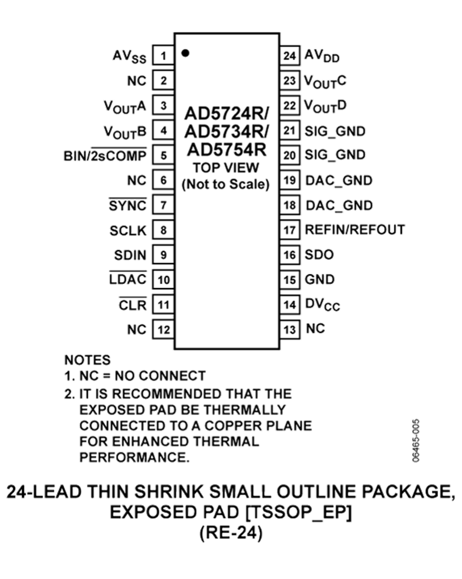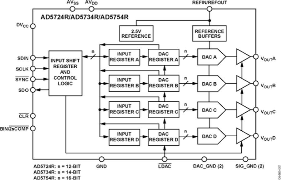 AD5724R/AD5734R/AD5754R采用串行接口,能够以最高30 MHz的时钟速率工作,并且与DSP和微控制器接口标准兼容。利用双缓冲,所有DAC可实现同时更新。对于双极性输出,输入编码为用户可选的二进制补码或偏移二进制(取决于 BIN/2sCOMP引脚的状态),单极性输出则为标准二进制。利用异步清零功能,可将所有DAC寄存器清零至用户可选的零电平或中间电平输出。这些器件采用24引脚TSSOP封装,保证温度范围为−40°C至+85°C工业温度范围。