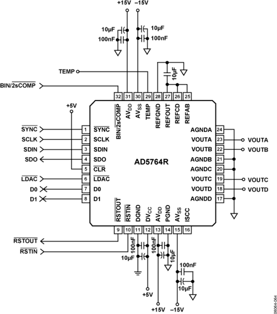 AD5764R是一款四通道、16位、串行输入、双极性电压输出DAC,采用±11.4 V至±16.5 V电源供电。标称满量程输出范围为±10 V。它内置输出放大器、基准电压缓冲器以及专有上电/省电控制电路。该器件还有一个数字I/O端口,可通过串行接口进行编程,并且内置一个模拟温度传感器。每个通道均配有数字偏置与增益调整寄存器。AD5764R是一款高性能转换器,可保证单调性,积分非线性(INL)误差为±1 LSB,噪声很低,建立时间为10 μs。它内置一个5 V片内基准电压源,其最大温度系数为10 ppm/°C。上电期间,当电源电压变化时,VOUTx通过一个低阻抗路径箝位在0 V。