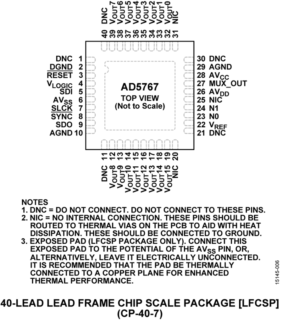 AD5767采用4 mm × 4 mm WLCSP封装,工作温度范围为−40°C至+105°C。