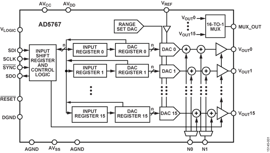 AD5767是一款16通道、12位、电压输出denseDAC®数模转换器(DAC)。