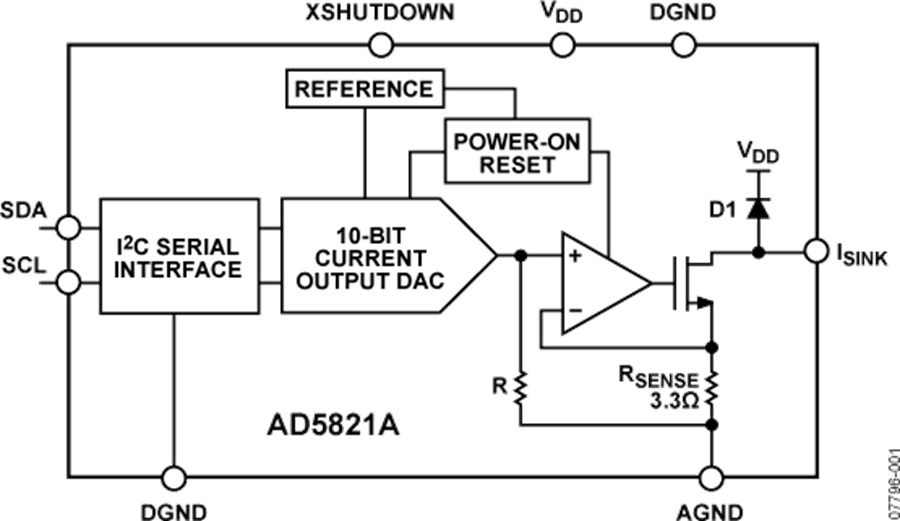 AD5821A是一款单通道、10位数模转换器(DAC),具有120 mA的吸电流输出能力,内置一个基准电压源,采用2.7 V至5.5 V单电源供电。这款DAC通过双线式I2C®兼容型串行接口进行控制,能够以最高400 kHz的时钟速率工作。AD5821A内置一个上电复位电路,确保DAC输出上电至0 V并保持该电平,直到执行一次有效的写操作为止。它具有省电特性,省电模式下功耗可降至1 µA(最大值)。AD5821A设计用于拍照手机、数码相机和便携式摄像机中的自动对焦、图像稳定及光学变焦应用。