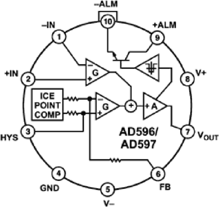 AD596/AD597 H封装选项包括热电偶故障报警功能;在温度比例测量模式下工作时,它可指示热电偶引线是否断开。报警输出具有灵活的格式,可用于驱动继电器、LED或TTL逻辑。