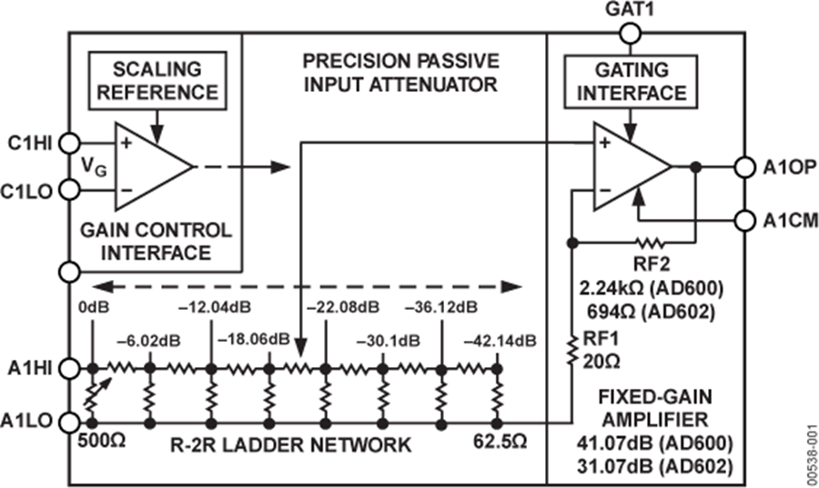 为实现高难度的性能目标,ADI公司开发出一种专有电路形式X-AMP®。X-AMP的每个通道均含有0 dB至-42.14 dB可变衰减器,后接高速固定增益放大器。这样,放大器永远不必处理较大输入,并且还可以利用负反馈来精确定义增益和动态范围。衰减器以7级R-2R梯形网络的形式实现,具有经激光调整至±2%的100 输入电阻。触点之间的衰减为6.02 dB,增益控制电路提供这些触点之间的连续插值,由此便可获得以dB为单位的线性控制功能。