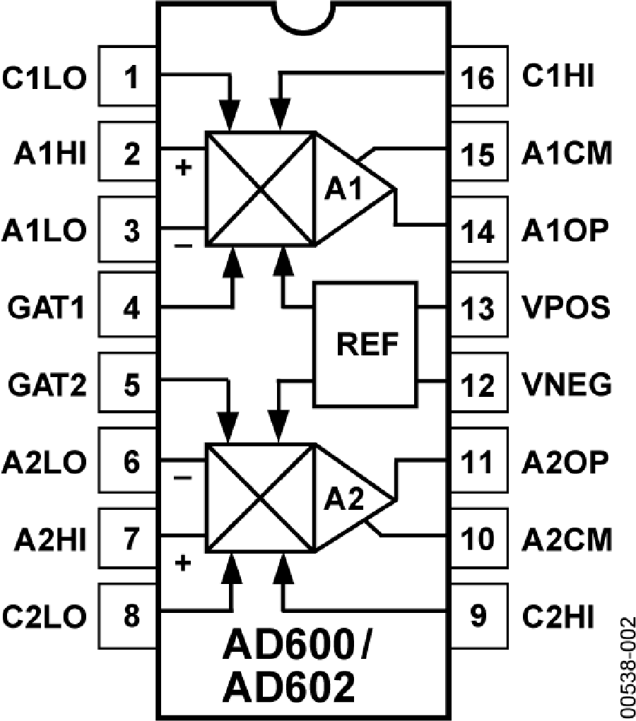 AD600J/AD602J的额定工作温度范围为0°C至70°C,采用16引脚PDIP (N)和16引脚SOIC封装。AD600A/AD602A的额定工作温度范围为-40℃至+85℃,采用16引脚CERDIP (Q)和16引脚SOIC封装。AD600S/AD602S的额定工作温度范围为-55℃至+125℃,采用16引脚CERDIP (Q)封装,符合MIL-STD-883标准。AD600S/AD602S也满足DESC SMD 5962-94572标准。