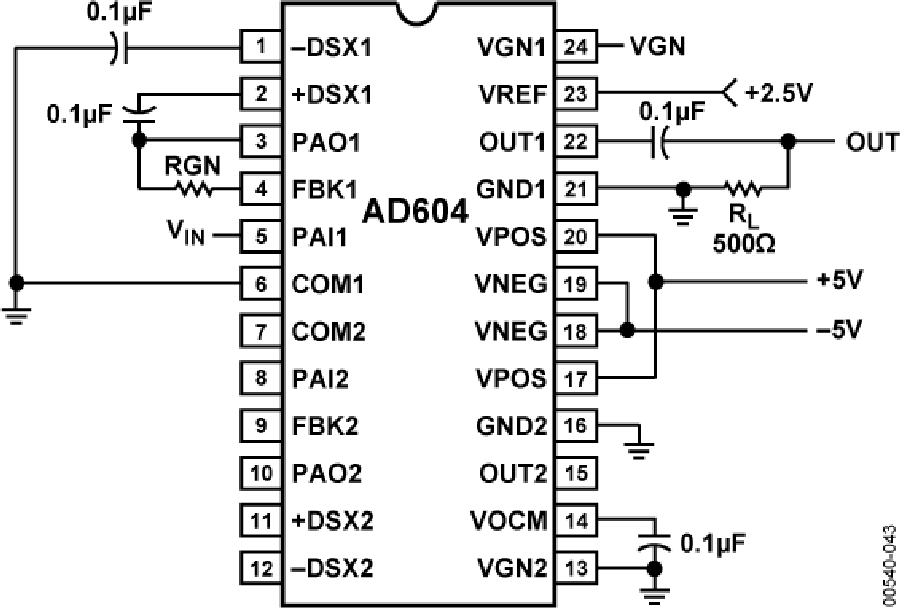 AD604采用24引脚SSOP、SOIC和PDIP封装,保证工作温度范围为−40°C至+85°C。