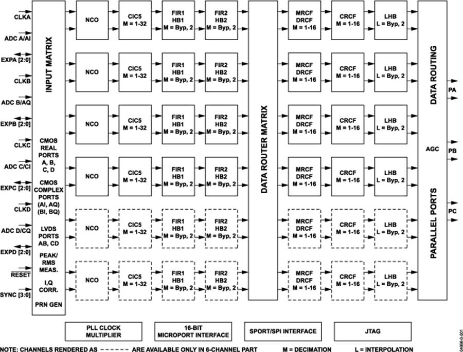 四个单端或两个LVDS并行输入端口(16位线性加上3位指数),工作频率为150 MHz