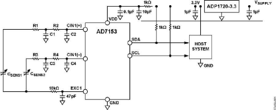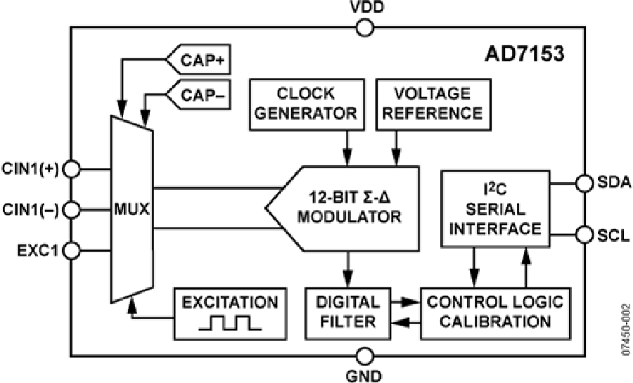 AD7152/AD7153可接受最大5 pF共模电容(不可变),后者可以通过一个可编程片内数字电容转换器(CAPDAC)来平衡。