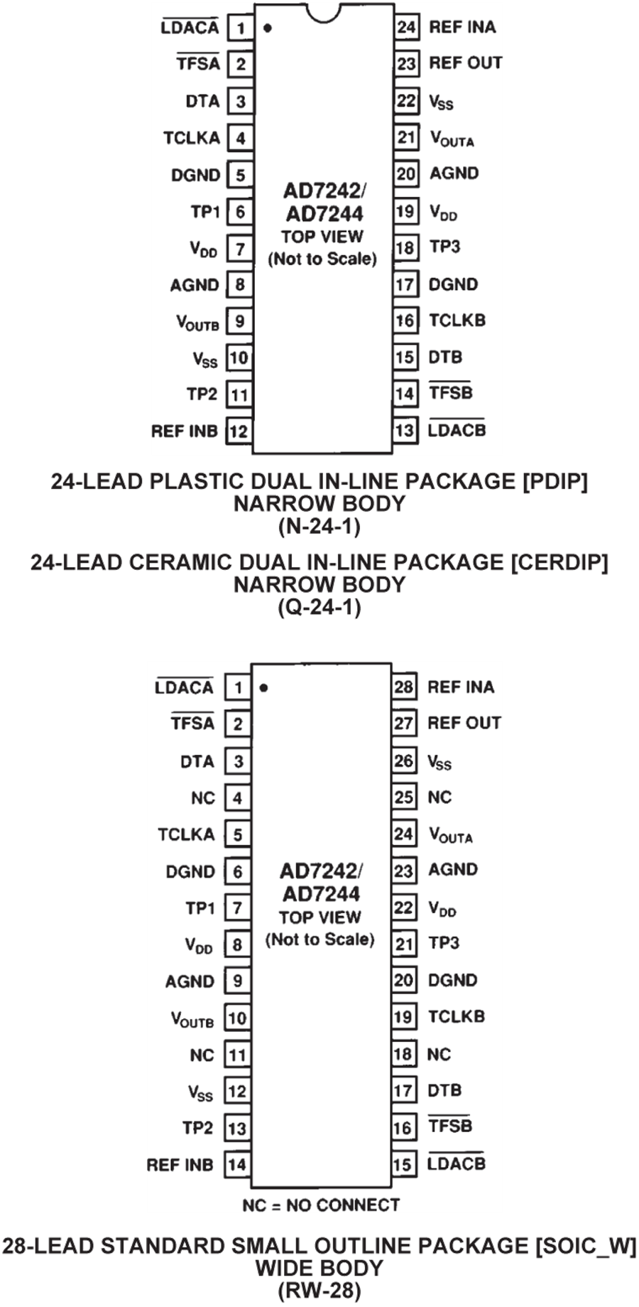 AD7242/AD7244采用线性兼容CMOS (LC2MOS)工艺制造,这是一种将精密的双极性电路与低功耗CMOS逻辑相结合的先进混合工艺技术。两款器件均提供两种封装:0.3英寸宽、24引脚塑料或密封双列直插式封装(DIP)和28引脚、塑料小形集成封装(SOIC)。AD7242和AD7244采用相同的引脚排列,便于从12位轻松升级为14位性能。
