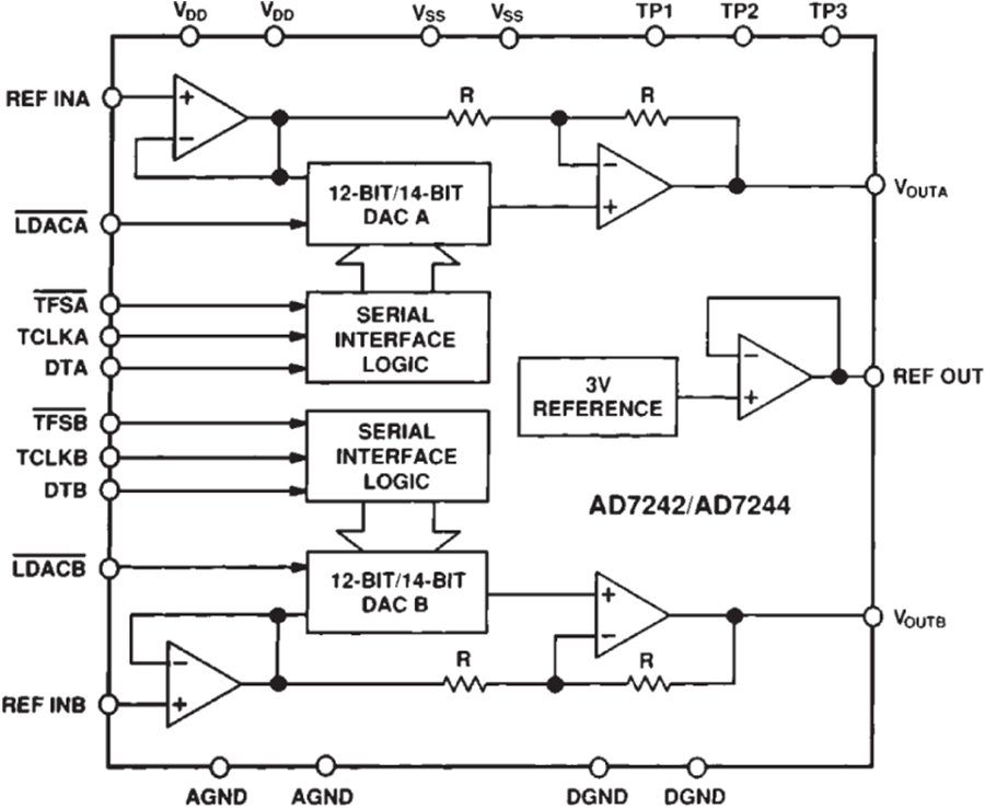 两个12/14位DAC,内置输出放大器AD7242:12位分辨率AD7244:14位分辨率