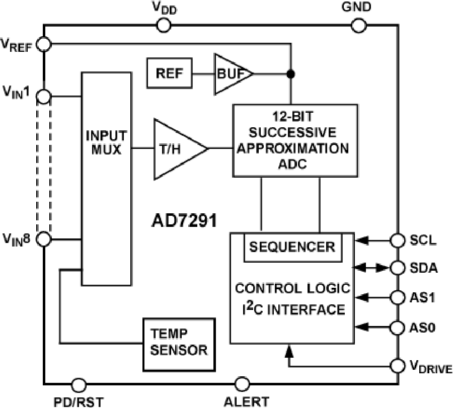 AD7291是一款12位、高速、低功耗、8通道、逐次逼近型ADC,内置温度传感器。它采用3.3V单电源供电,配有I2C®兼容接口。采样保持放大器可处理频率高达50 MHz的输入信号,多路复用器则可用于8通道采样。