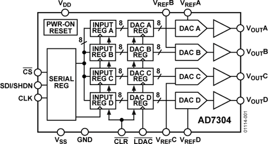 AD7304的双缓冲串行数据接口利用数据输入(SDI)、时钟(CLK)和芯片选择(CS) 引脚,提供高速、三线式、SPI和微控制器兼容型输入。