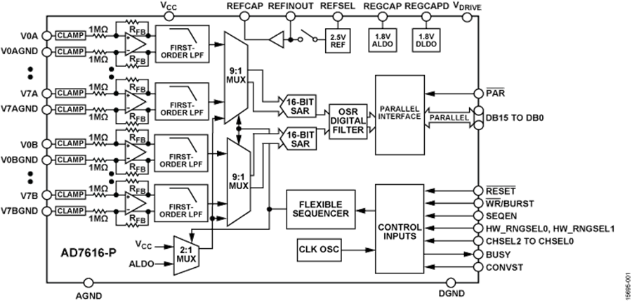 该器件均内置模拟输入箝位保护、一个双路16位电荷再分配逐次逼近型寄存器(SAR)模数转换器(ADC)、一个灵活的数字滤波器、2.5 V基准电压源和基准电压缓冲器以及高速并行接口。