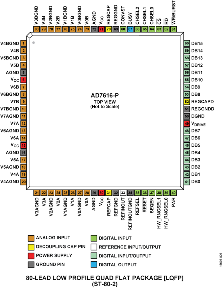输入箝位保护电路可以耐受高达±21 V的电压。无论以何种采样频率工作,AD7616-P的模拟输入阻抗均为1 MΩ。它采用单电源工作方式,具有片内滤波和高输入阻抗,因此无需驱动运算放大器和外部双极性电源。