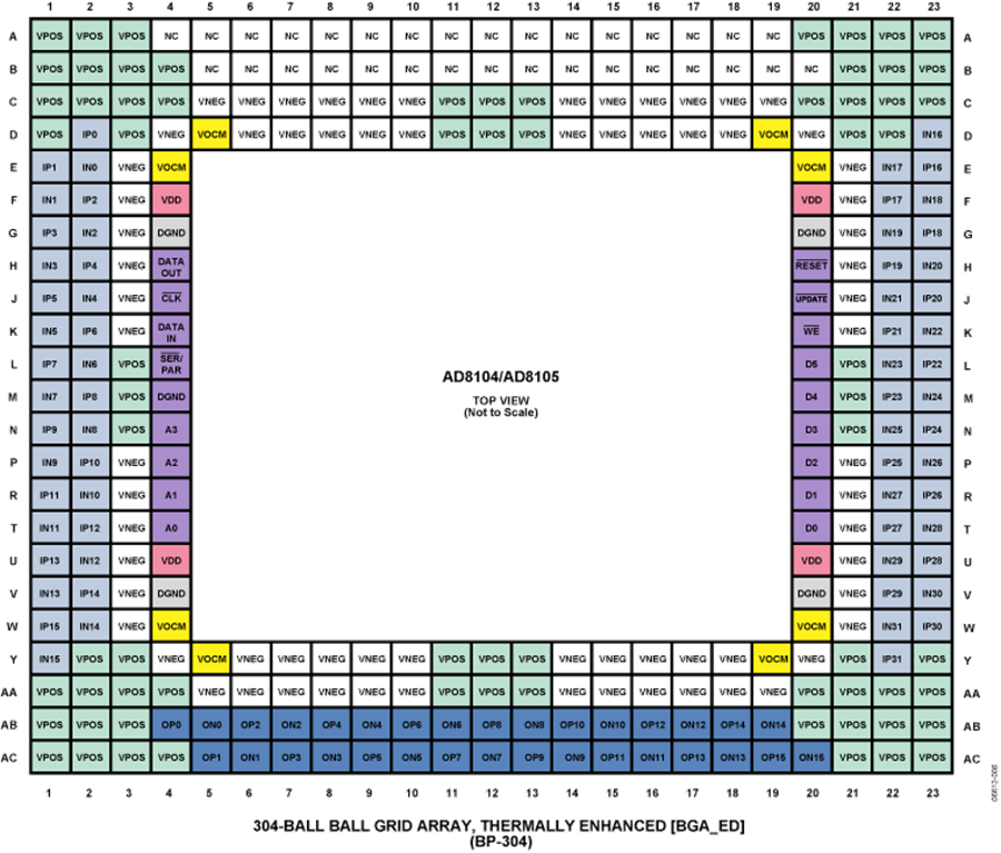 AD8104/AD8105采用304引脚BGA封装,工作温度范围为−40°C至+85°C工业温度范围。