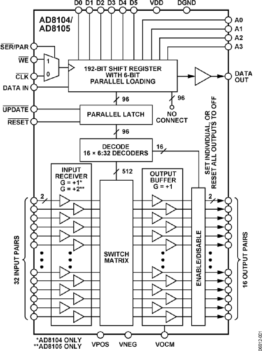 AD8104AD8105均为高速32 × 16模拟交叉点开关矩阵。具有600 MHz带宽和1800 V/μs压摆率,适用于高分辨率计算机图形(RGB)信号开关。两款器件的串扰性能均低于-70 dB,隔离性能为-90 dB (5 Mhz),因而适合许多高速应用。同时0.1 dB平坦度大于50 MHz,堪称复合视频开关的理想之选。