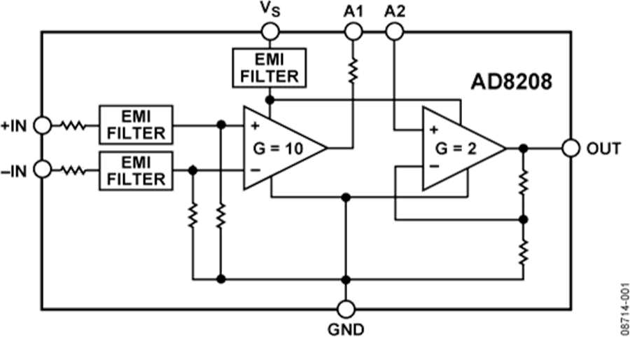 AD8208的前置放大器(A1)输出端提供一个外部可接触的100 kΩ电阻,可以利用它来进行低通滤波以及建立20以外的增益。