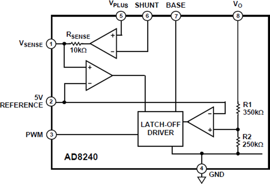 当电流达到预设电平时,输出电压会被锁定,从而限制输出电流。电流限制的设置方法如下:选择适当的外部分流值,使得当电流超过最大电平时,检测放大器的输出略微超过5 V基准电平。当检测放大器输出超过5 V时,便会触发内部比较器,导致驱动器锁定输出电压。在下一个PWM周期中,锁存会复位。也可以由微控制器或外部比较器,通过测量检测放大器输出来检测过流状况。
