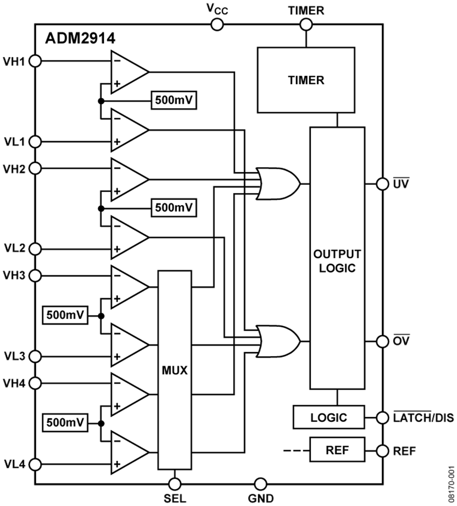 ADM2914含有一路1 V缓冲基准电压输出REF;当监控负电压时,它可充当偏置电压。三态SEL引脚决定第三路和第四路输入的极性,即通过引脚配置该器件来监控正电源或负电源。