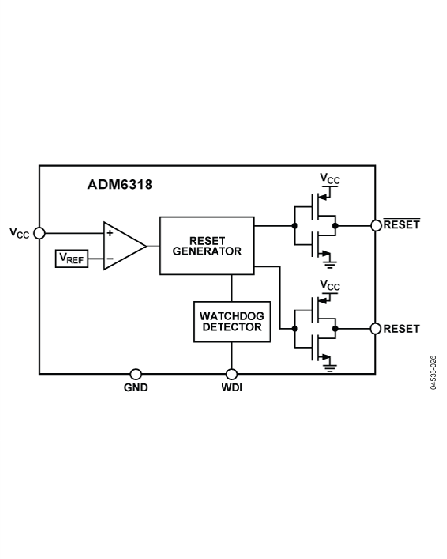 ADM6316/ADM6317/ADM6318/ADM6319/ADM6320/ ADM6321/ADM6322采用5引脚SOT-23封装,功耗典型值仅为3 μA,适用于低功耗、便携式应用。