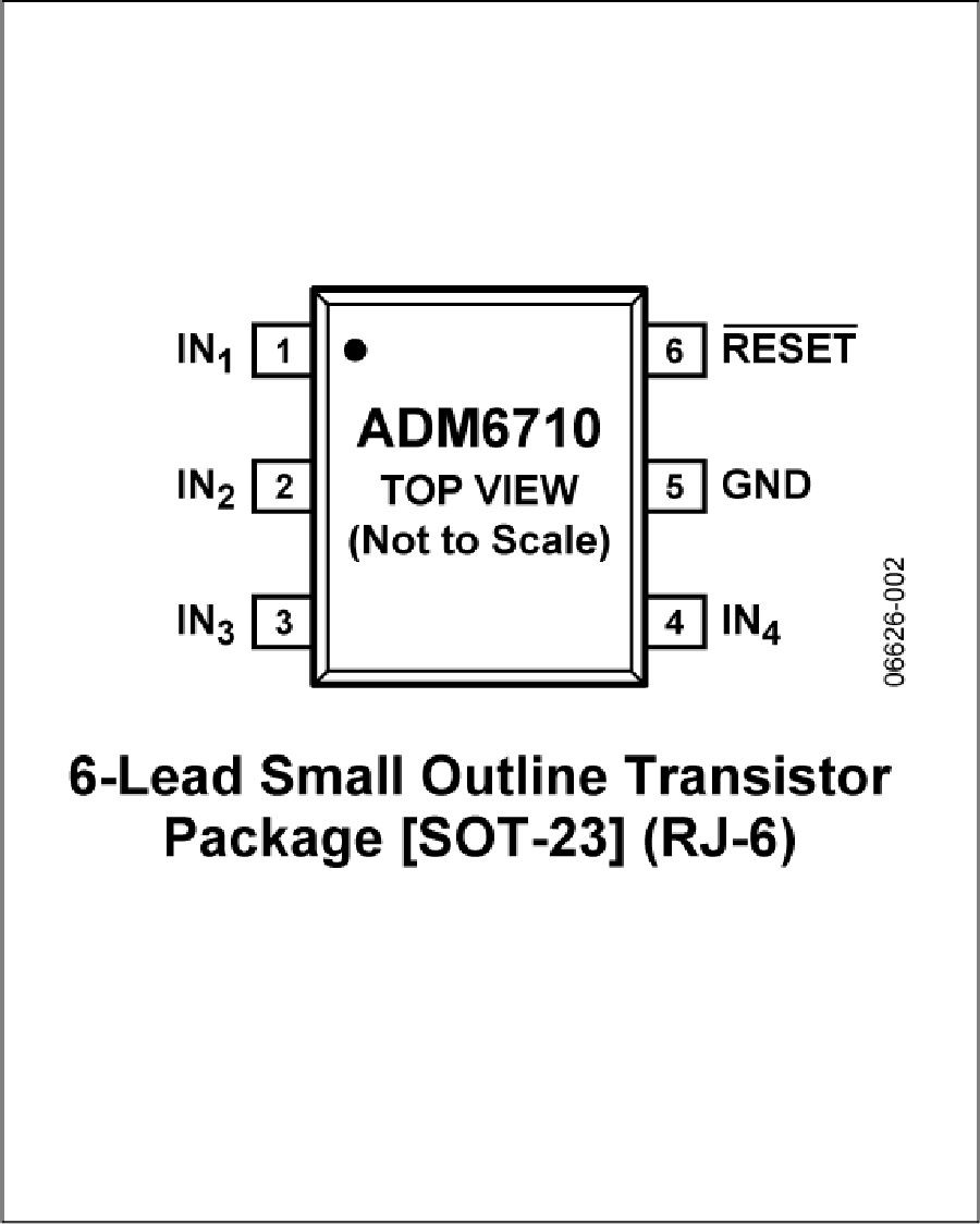 未用的受监控输入不应浮动或接地,而应将其与大于其指定阈值电压的电源电压相连。ADM6710采用6引脚SOT-23封装,工作温度范围为−40°C至+85°C扩展温度范围。