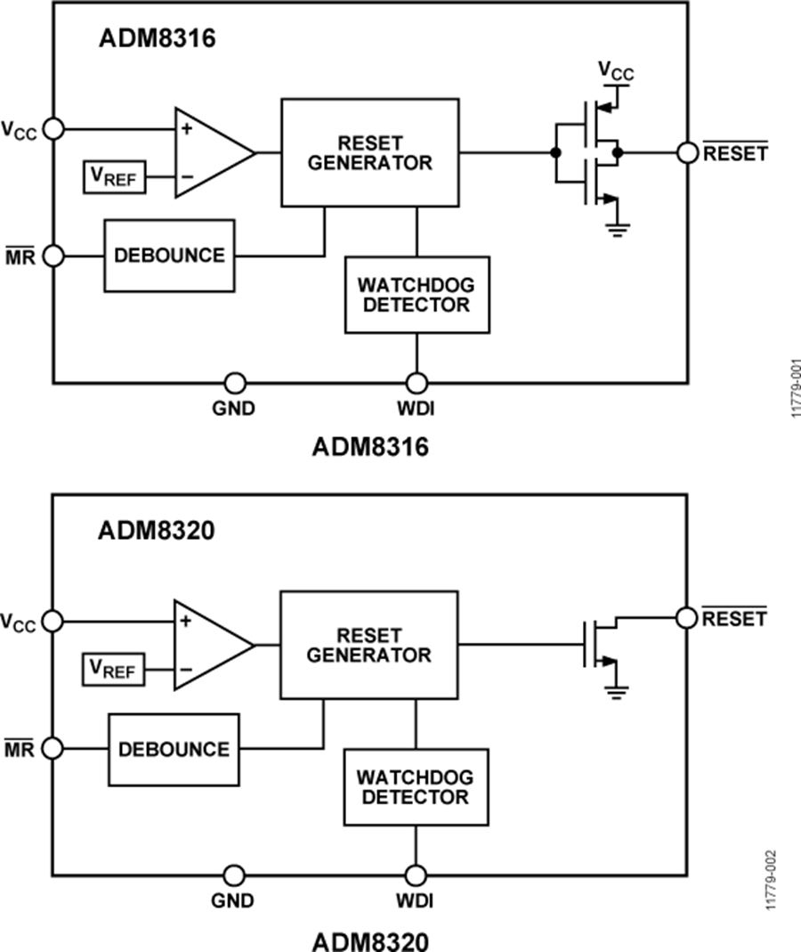 ADM8316/ADM8318/ADM8319/ADM8320/ ADM8321/ADM8322 均为电源监控电路,用来监控微处理器系统的电源电压和代码执行完整性。片内看门狗定时器不仅能提供上电复位信号,若微处理器未能在预设超时周期内发出选通脉冲,还能复位微处理器。 复位信号也可以由外部按钮,通过手动复位输入引脚置位。每款器件均提供26种复位阈值选项,在2.5 V至5 V范围内,以100 mV递增。 另外还有四个复位超时选项:1 ms、20 ms、140 ms和1120 ms(最小值),以及四个看门狗超时选项:6.3 ms、102 ms、1600 ms和25.6 s(典型值)。