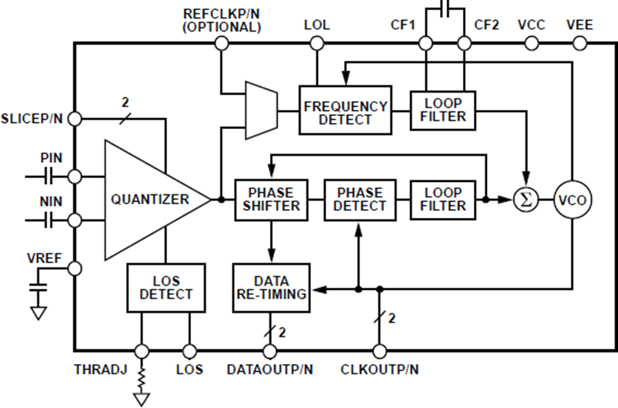 当输入信号电平降至用户可调阈值以下时,接收器前端信号丢失(LOS)检测电路会予以提示。LOS检测电路具有迟滞特性,可防止输出震颤。