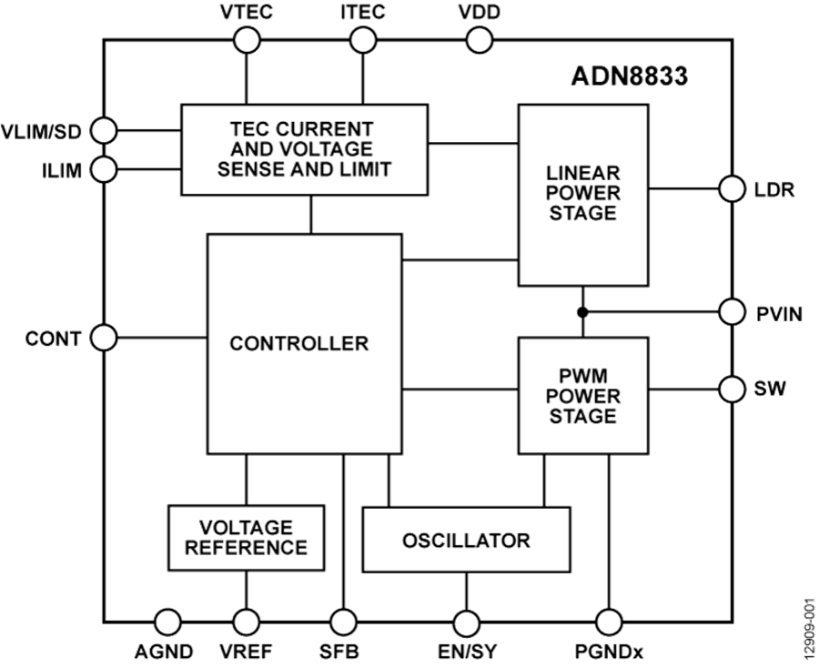 ADN8833是一款集成1 A功率MOSFET的单芯片H桥TEC驱动器。 它包括提供线性驱动器(LDR)输出的线性功率级,以及提供SW输出的脉冲宽度调制(PWM)功率级。 根据CONT输入的控制电压,ADN8833通过TEC驱动电流,将连接至TEC模块的激光二极管或无源组件的温度建立至可编程的目标温度。