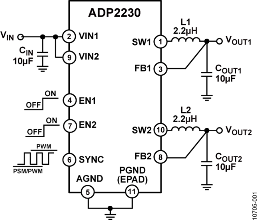 ADP2230提供多种选择来设置工作频率。 为实现轻载效率最大化,ADP2230在PSM模式下能以更低的开关频率工作,并随着负载增加而自动切换到PWM模式。 当噪声比效率更为重要时,可强制ADP2230采用仅PWM工作模式(2 MHz)。 ADP2230还可通过SYNC引脚与1.5 MHz至2.5 MHz外部时钟同步。 使用外部时钟同步控制时,两个降压输出与所施加的时钟信号同相。