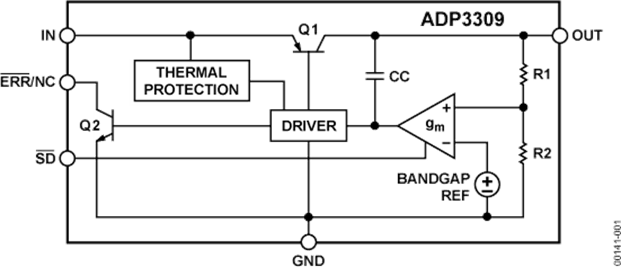 ADP3309属于ADP330x系列精密低压差anyCAP稳压器 。 它与National公司的LP2981引脚兼容、功能兼容 , 但其性能优于后者。ADP3309采用新颖的架构和改良的工艺,与传统LDO相比性能更出色。它采用专利设计,仅需一个0.47 µF输出电容便可保持稳定。这款器件使用任何类型的电容均可稳定工作,与电容的等效串联电阻(ESR)值无关,包括适合空间受限应用的陶瓷型电容。ADP3309在室温条件下可达到±1.2%的精度,温度、线路和负载调节的整体精度为±2.2%。100 mA时,其压差仅120 mV(典型值)。该器件还具有限电流和关断特性。在关断模式下,地电流降至约1 µA。ADP3309具有较宽的输入电压范围(2.8 V至12 V),并提供100 mA以上的负载电流。ADP3309 anyCAP LDO具有较宽的输出电压范围。